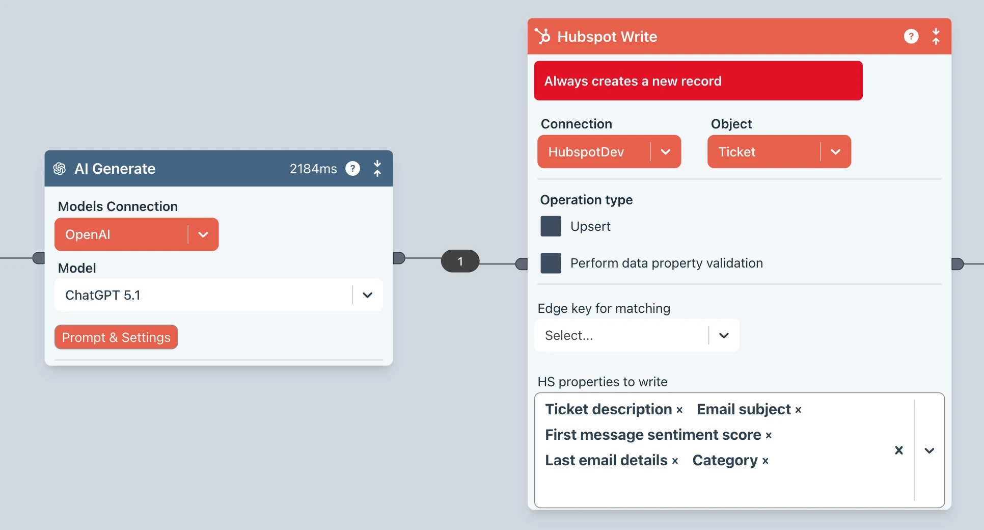 The Ziggy flow receives the email data then uses the AI Generate block to calculate a happiness score and categorize the contents before creating a new ticket in your CRM.