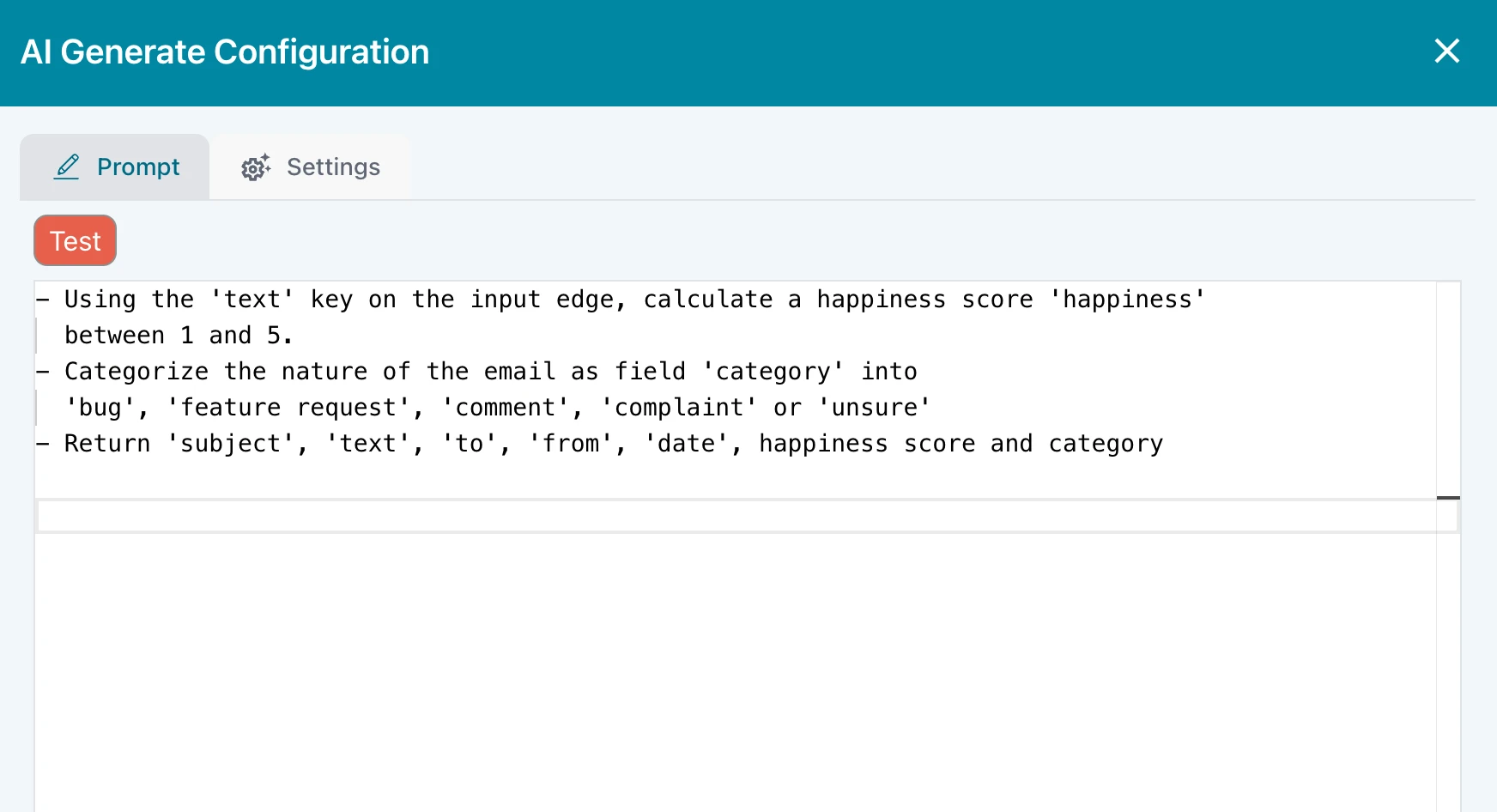 The AI Generate block lets you configure a prompt that does whatever you need it to do. It puts the result onto the output edge as you request.